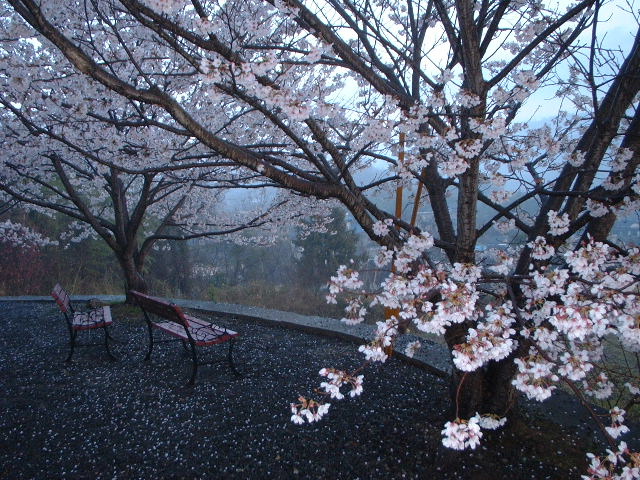 桜は満開を待たず昨夜からの雨ではやくも散り始め。