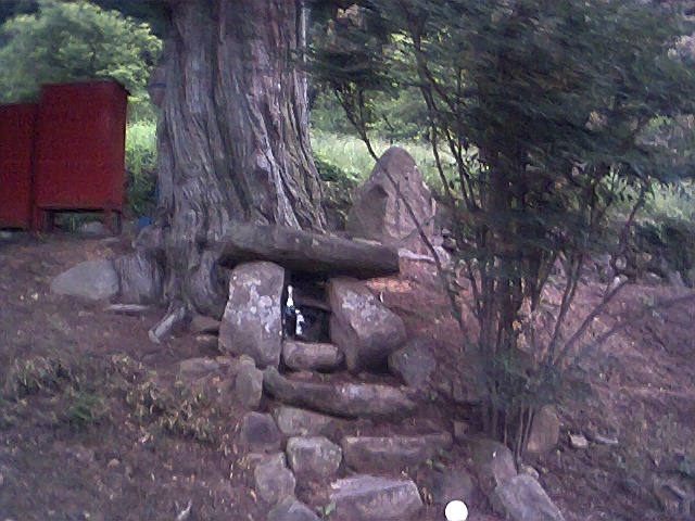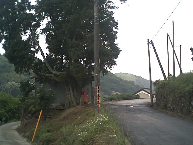 「神」と祀られた木はこの細い道と池にはさまれたところ。