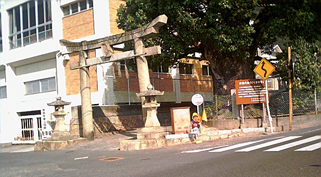 神社鳥居隣に接して見えるのは元・東安倉小学校体育館。