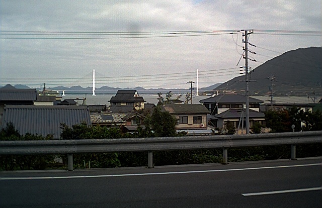 (伯方町伊方から見る多々羅大橋、右生口島・左大三島)