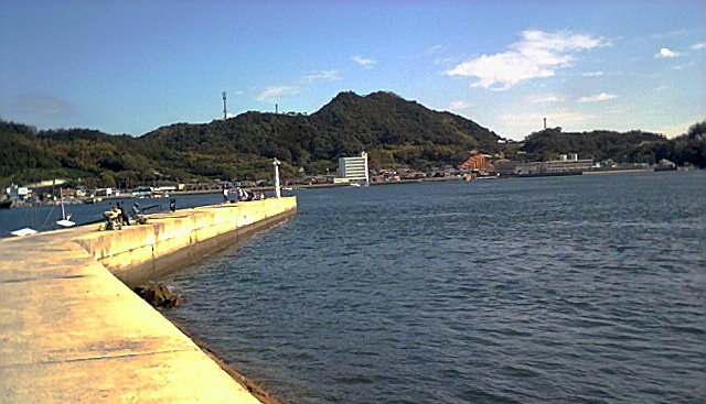 防波堤内側は静か。外側には潮が円くなってうちよせる。釣り人10人くらい。