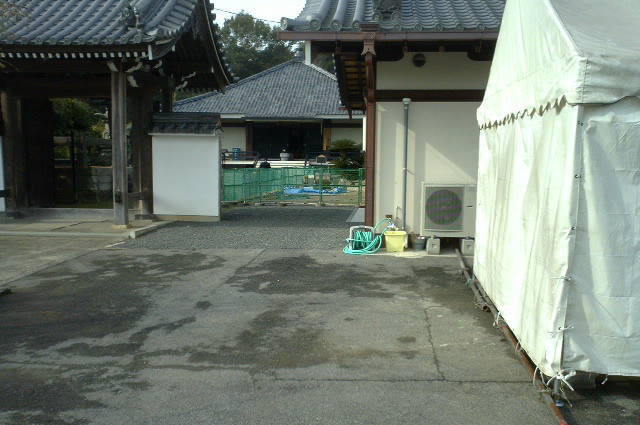 (教積院、写真左手は本堂の工事中。なんと天下の「清水建設」の施工。)