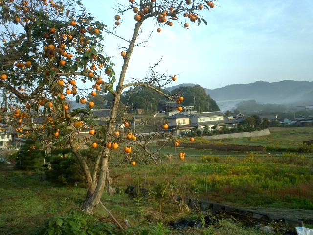 柿の実がなり、その向こうの丘は神社。そのまた向こうに山陽道の高架が見える。