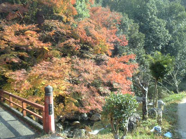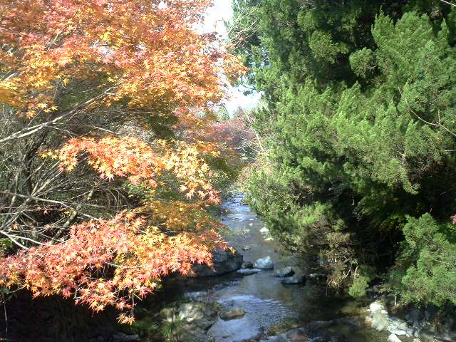 鬼の湯荘の前には美山川が流れ紅葉がみごと。