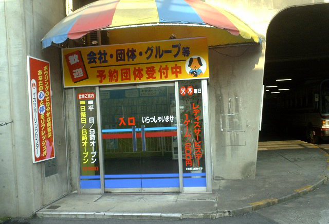 コ線橋から降りる、橋の階段から見るボーリング場の入り口。