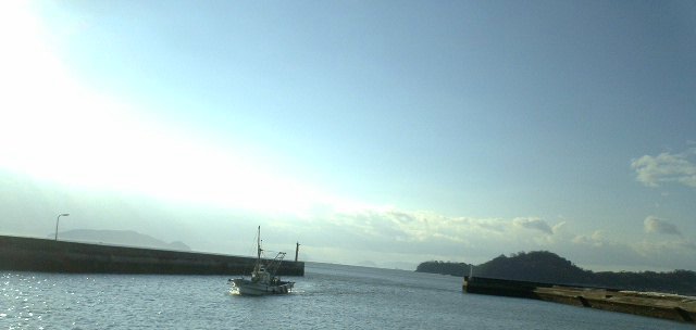 漁船が一隻戻ってきている。その沖の海には笠岡諸島がきれいに見える。