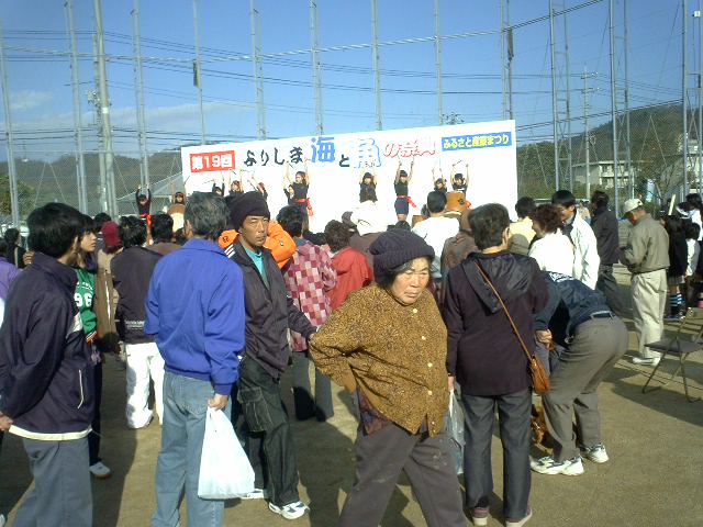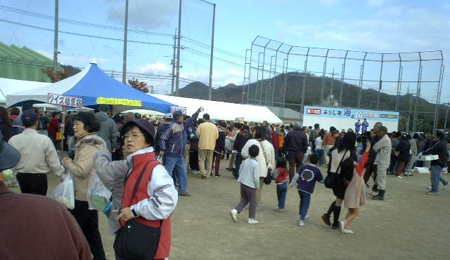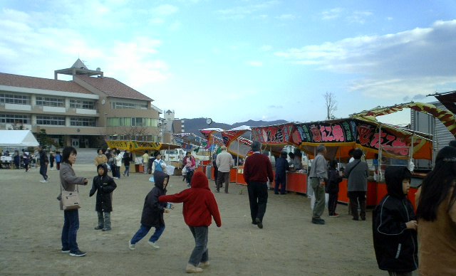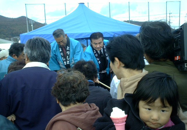ここで会場で買った汁、うどん、タコ弁当などを家族連れが食べている。