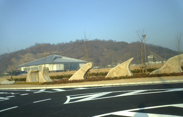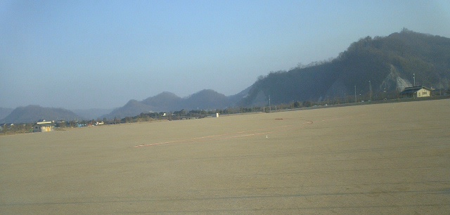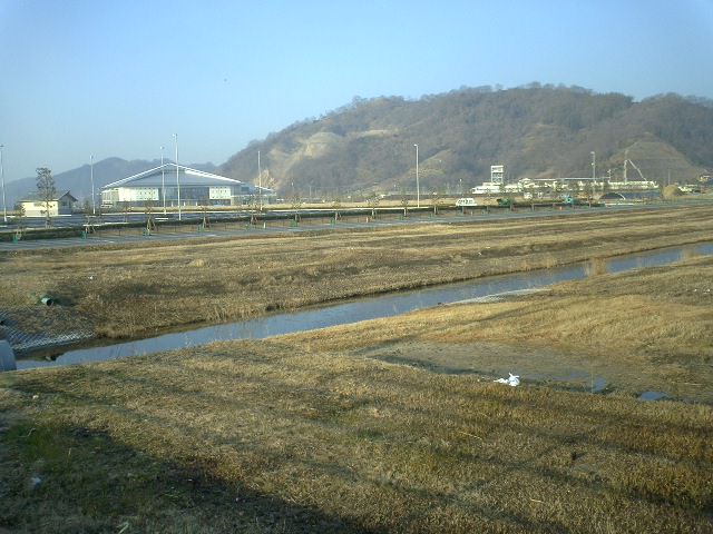 国道2号線と干拓地を結ぶ金崎橋、その橋を渡ると工事中のスポーツ公園が見えてくる。