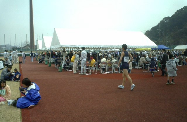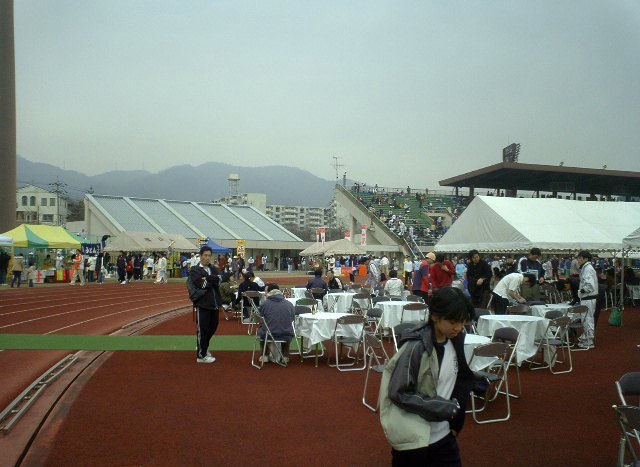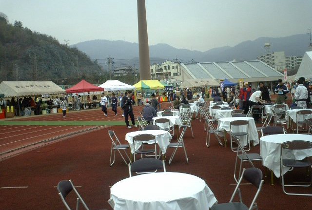 会場の陸上競技場の内外にはテント・イスが多数。