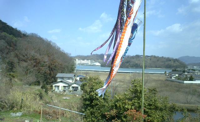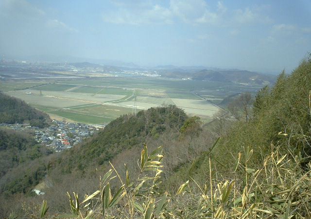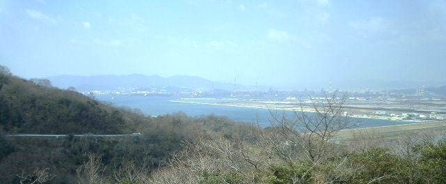 真下には福浦、国道2号線笠岡バイパスの地質工事のヤグラも見え、対岸は茂平方向。