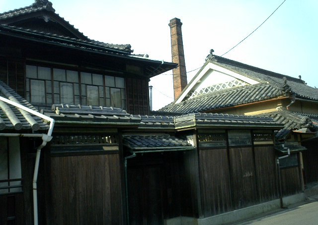 虚空蔵山のしたの田んぼの中に赤レンガの煙突と、長い白壁と屋根に「磯千鳥」の名がよくみえる。