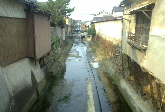 称念寺橋のうえから下流をみれば川床が変化してしるだけの西本町。