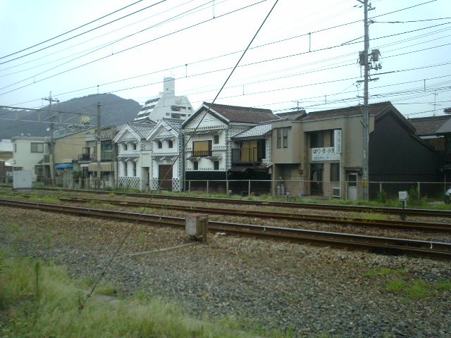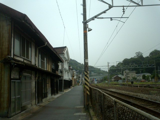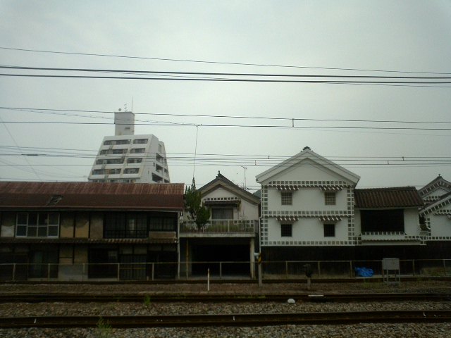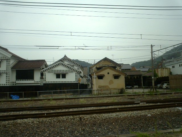 白壁の倉庫が笠岡駅の鉄道に沿ってある。