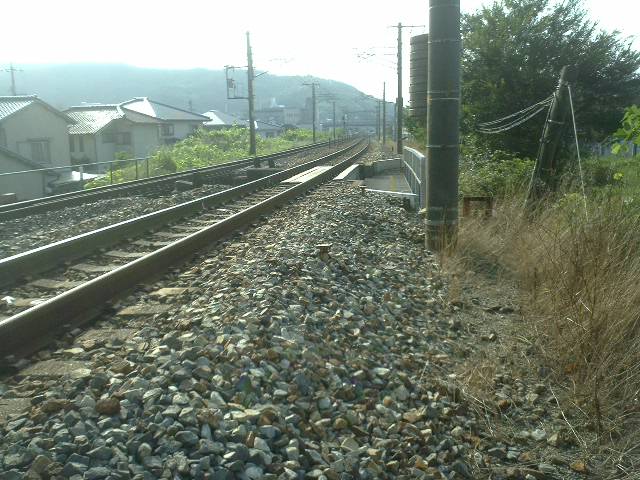 (笠岡市金浦、鉄南から見る山陽線。トンネル近くまだ単線のレール)