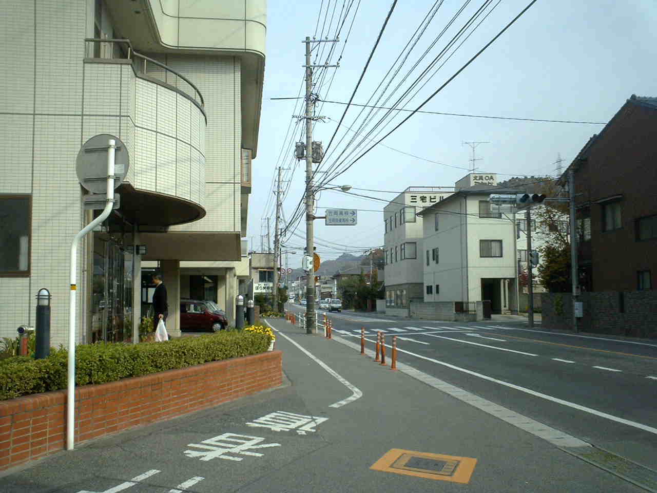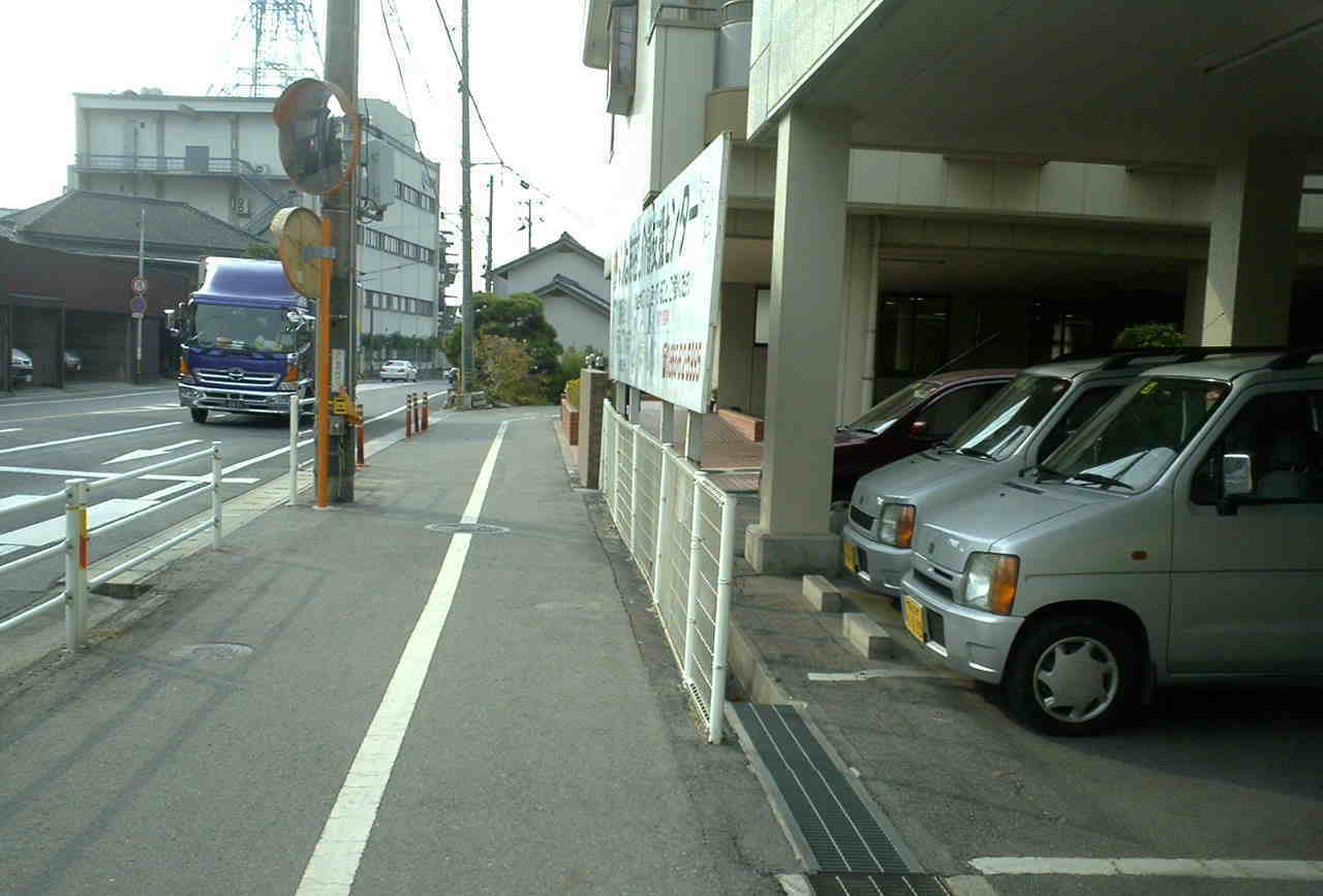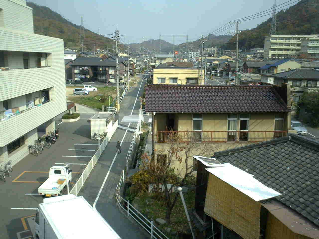 そして中央病院の屋上駐車場から北を見れば県道と旧・井笠鉄道道が並行している。 左手の井笠鉄道道は、えいちゃんが南に走る時はこの道になる。 |