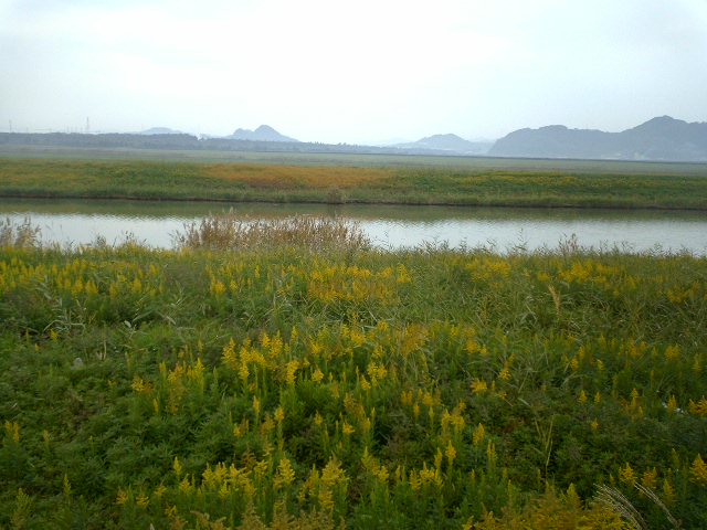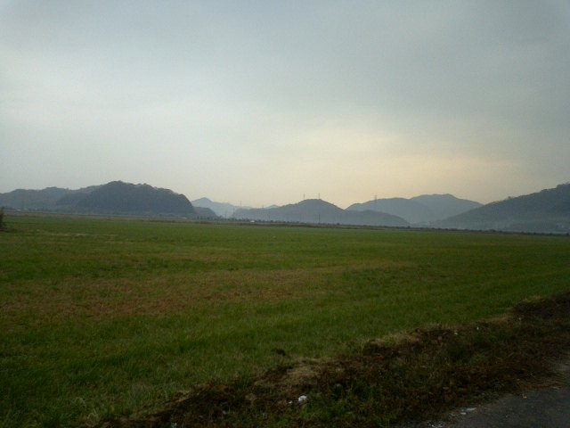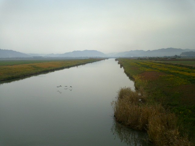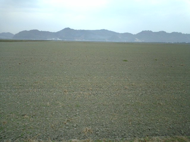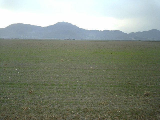 上の写真は正面・応神山。中央水路に鳥が飛び、その左右はまったくの平野。