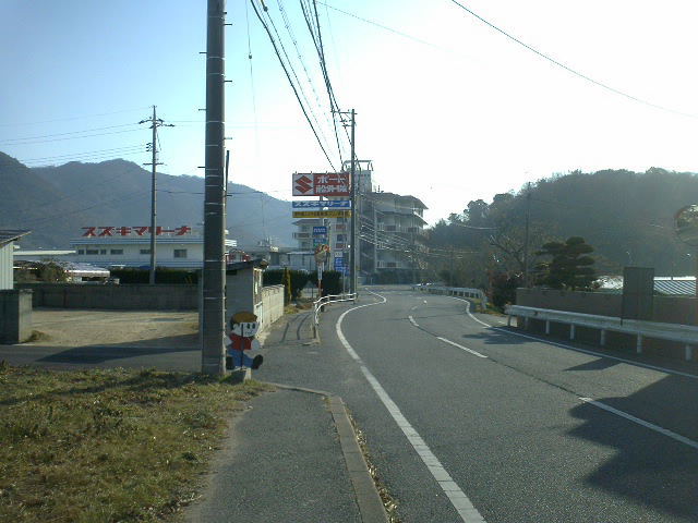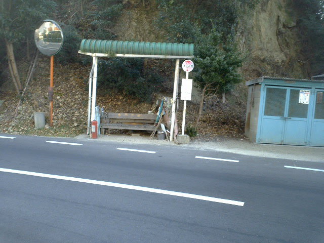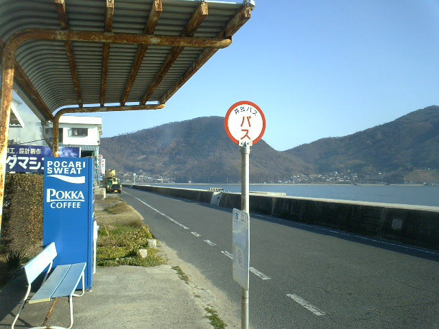 バス停はすこし汚れた感じだが、お遍路さんのわらじなどが掛けてありなんとなく「神島」という雰囲気。