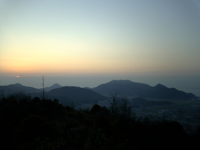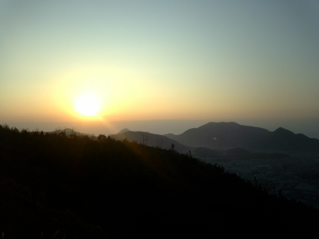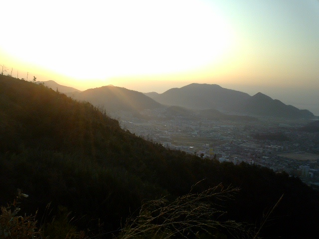 そして初日が昇るころ応神山の尾根を西に東に走った。 今日の初日は寄島と里庄の中間あたりの山から昇った。 応神山山頂では一人の男性に会った。 その人は初日を見に富岡方面から登ってきた。 笠岡の町が初日に照らされる頃、えいちゃんは笠神社に降りていった。