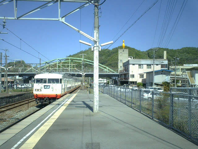 えいちゃんが乗る電車がやってきた。 いっけん「快速」ふうだが「鈍行」です。 |