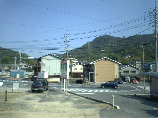 旧道は山裾の道、その道から東を見れば田頭の県道にそってもりやす病院などがある。 |