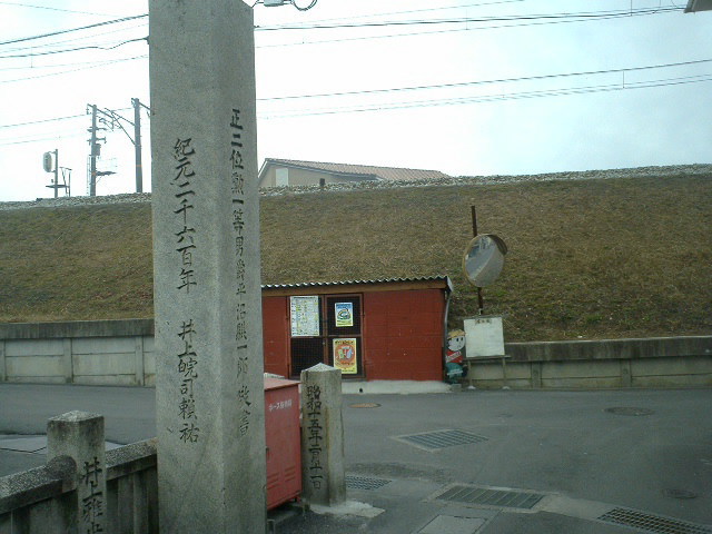 (金浦八幡神社。参道はこの「紀元二千六百年」の石柱からはじまる、書は元首相・平沼麒一郎)