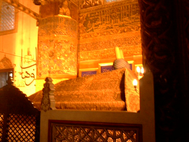 コンヤにあるメブラーナ博物館。 セルジューク朝時代にメブラーナ教という宗教がここでできてさかえた。 ガイドブックによれば、白い衣装で踊るのが有名だそうだ。 古い経典もあり、 これは教祖の髭がはいっているお宝だそうだ。