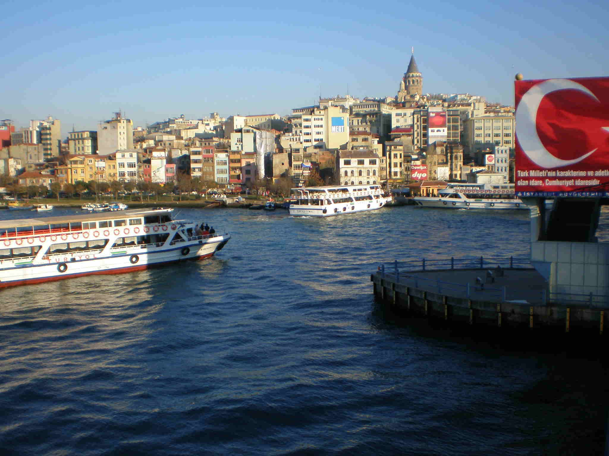 ガラタ橋の奥側は渡しの客船がひっきりなし。 船同士が衝突しそうになるくらいの出船・入船。
