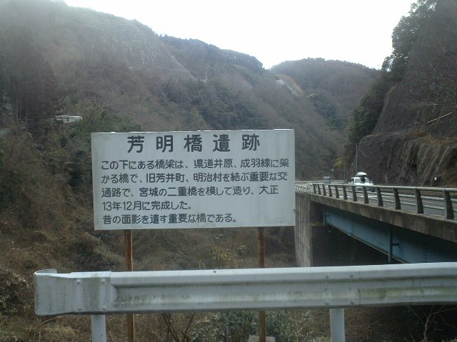 橋の完成記念碑だけは現在の国道脇に移設してある、↓。