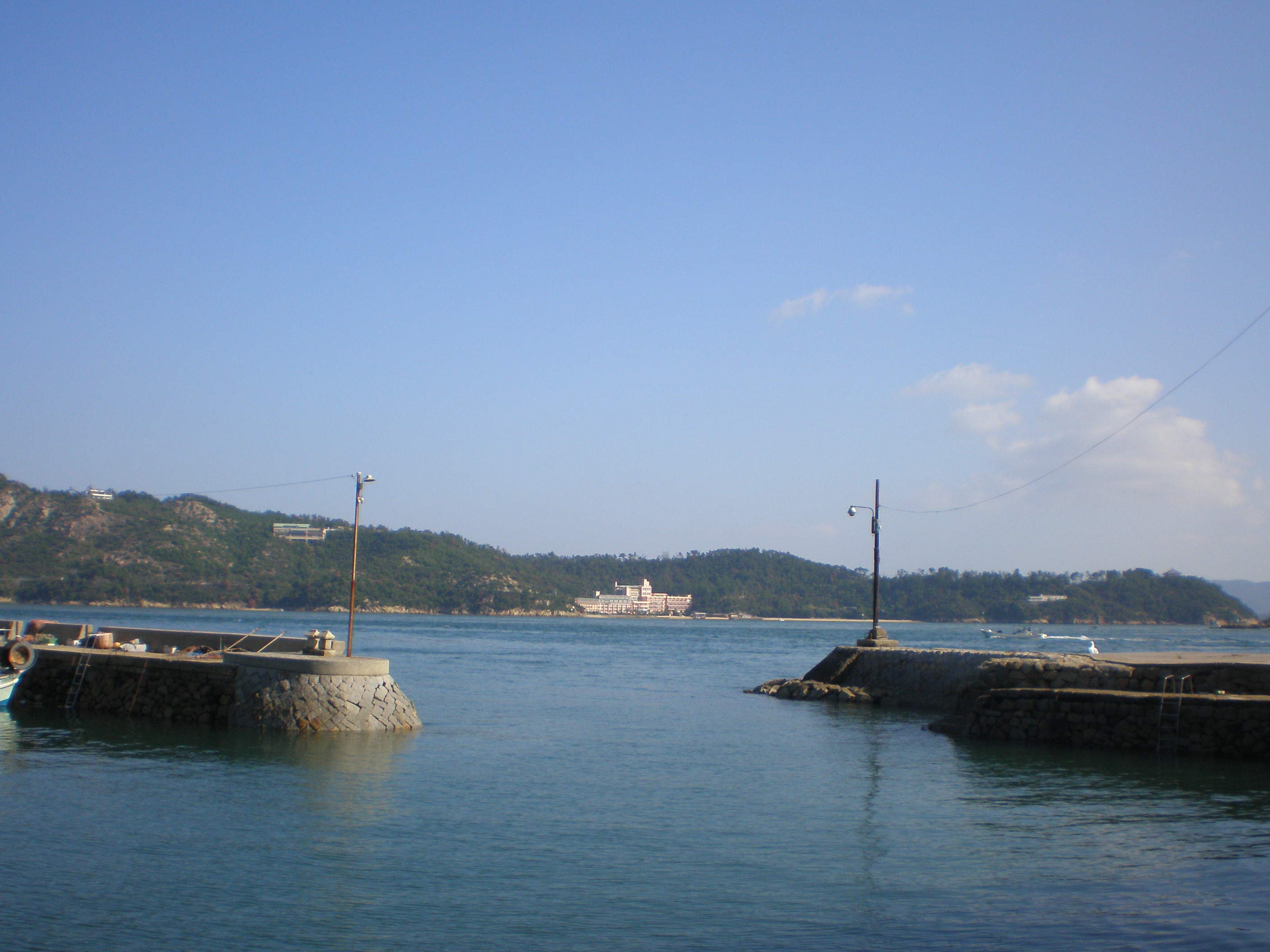 なつかしい防波堤のむこうに鷲羽山下電ホテル。