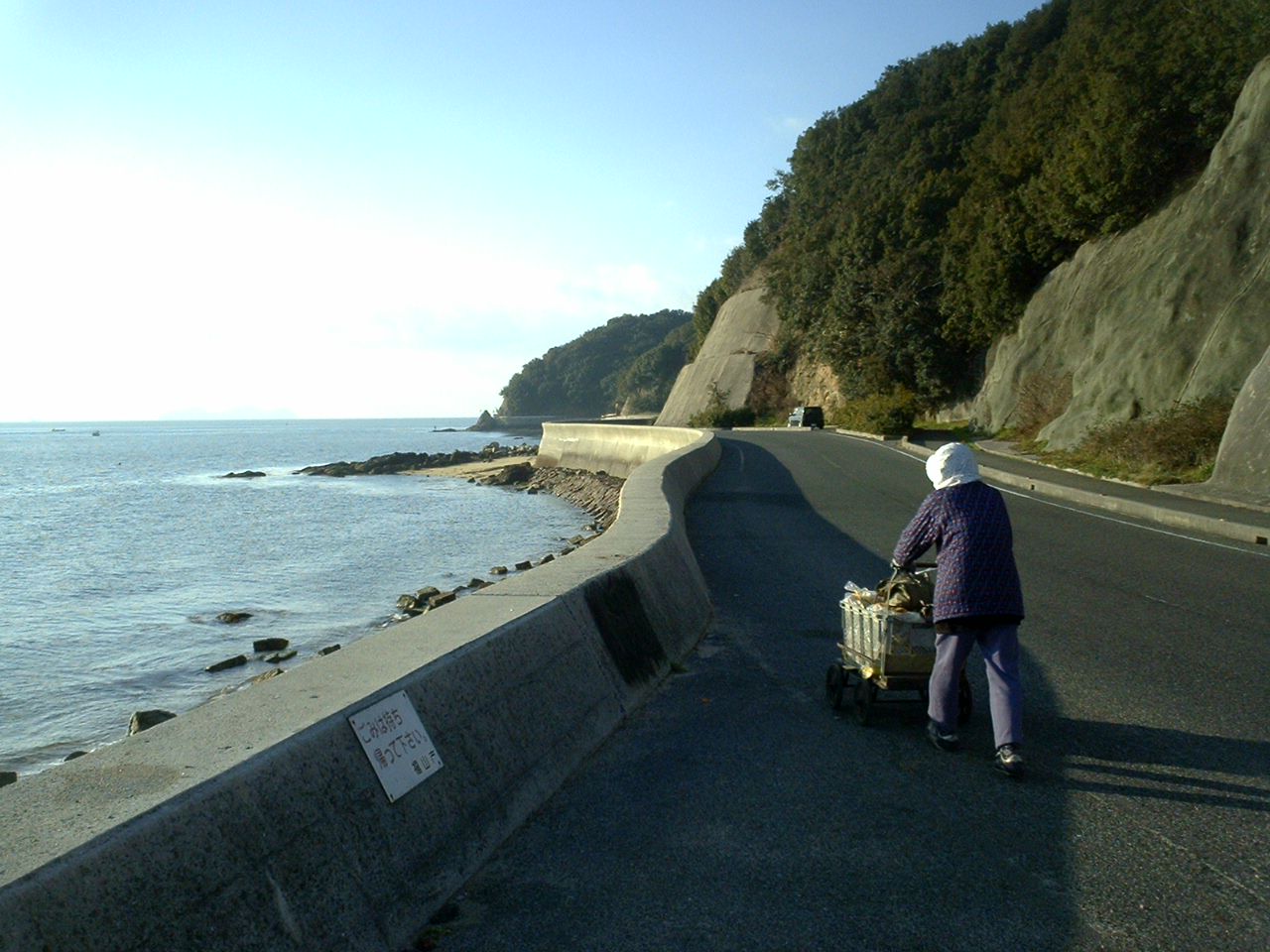 低い護岸に守られた海辺の道は、その波返しの部分もなくなり、そこにはガードレールもない海辺の道となった。