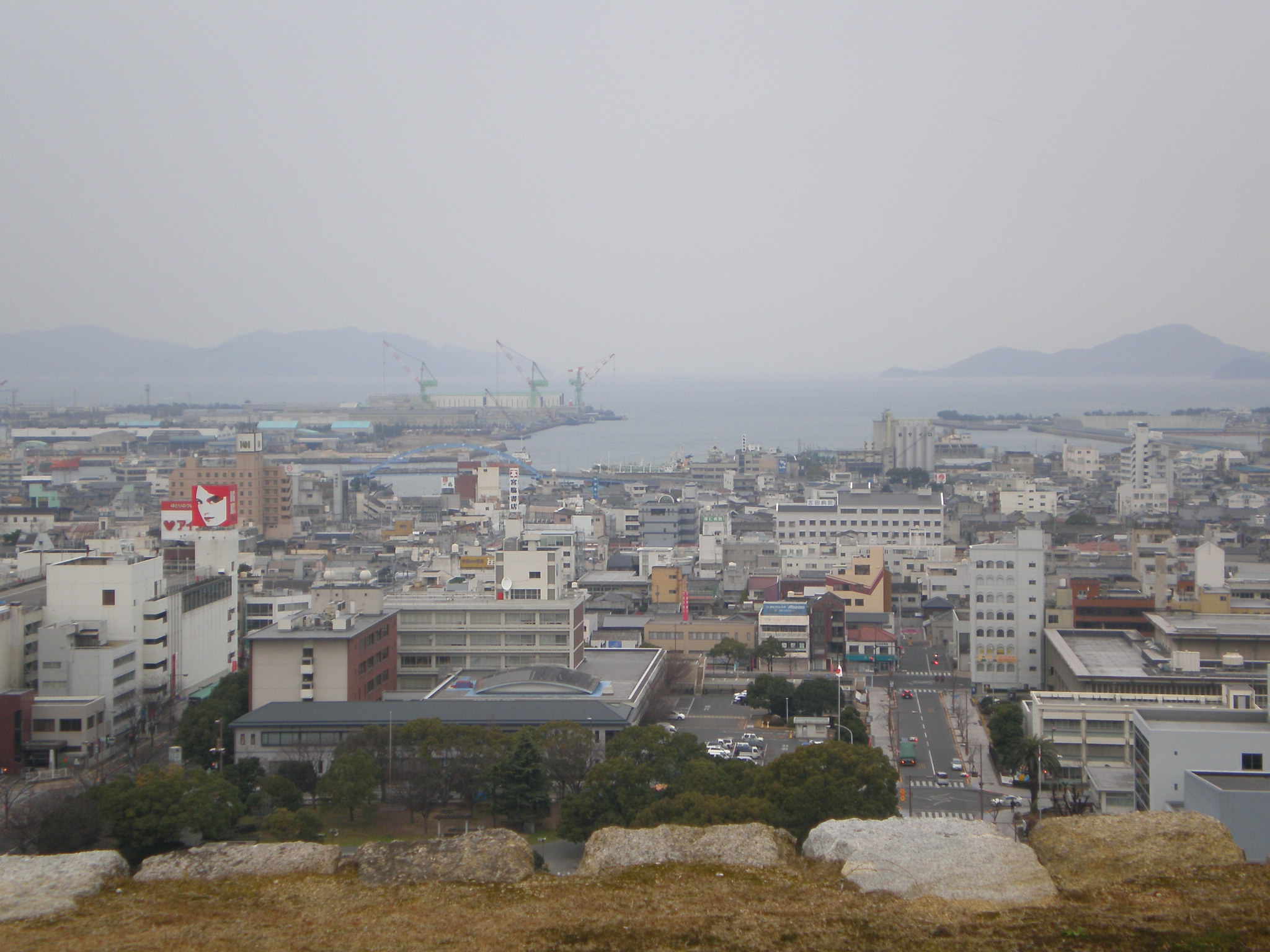 天守閣の場所からみる丸亀市街地と瀬戸内海。