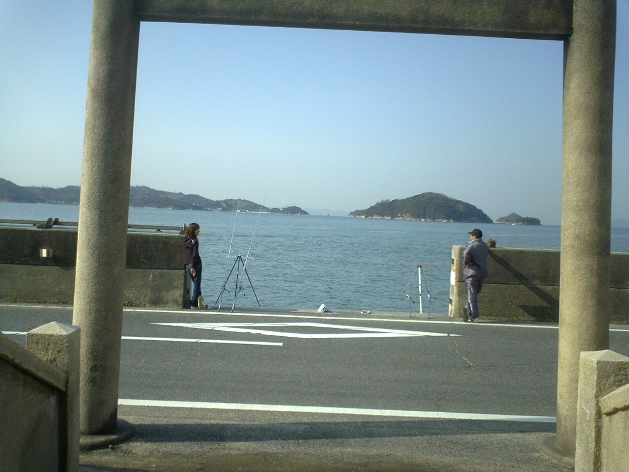 神島神社の桜を見てみよう。 境内にも、その外にも、桜の木は一本もなかった。 鳥居の前には釣り人二人。