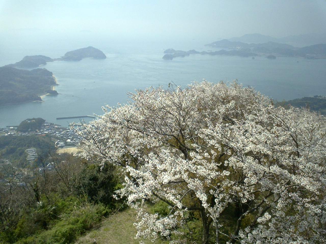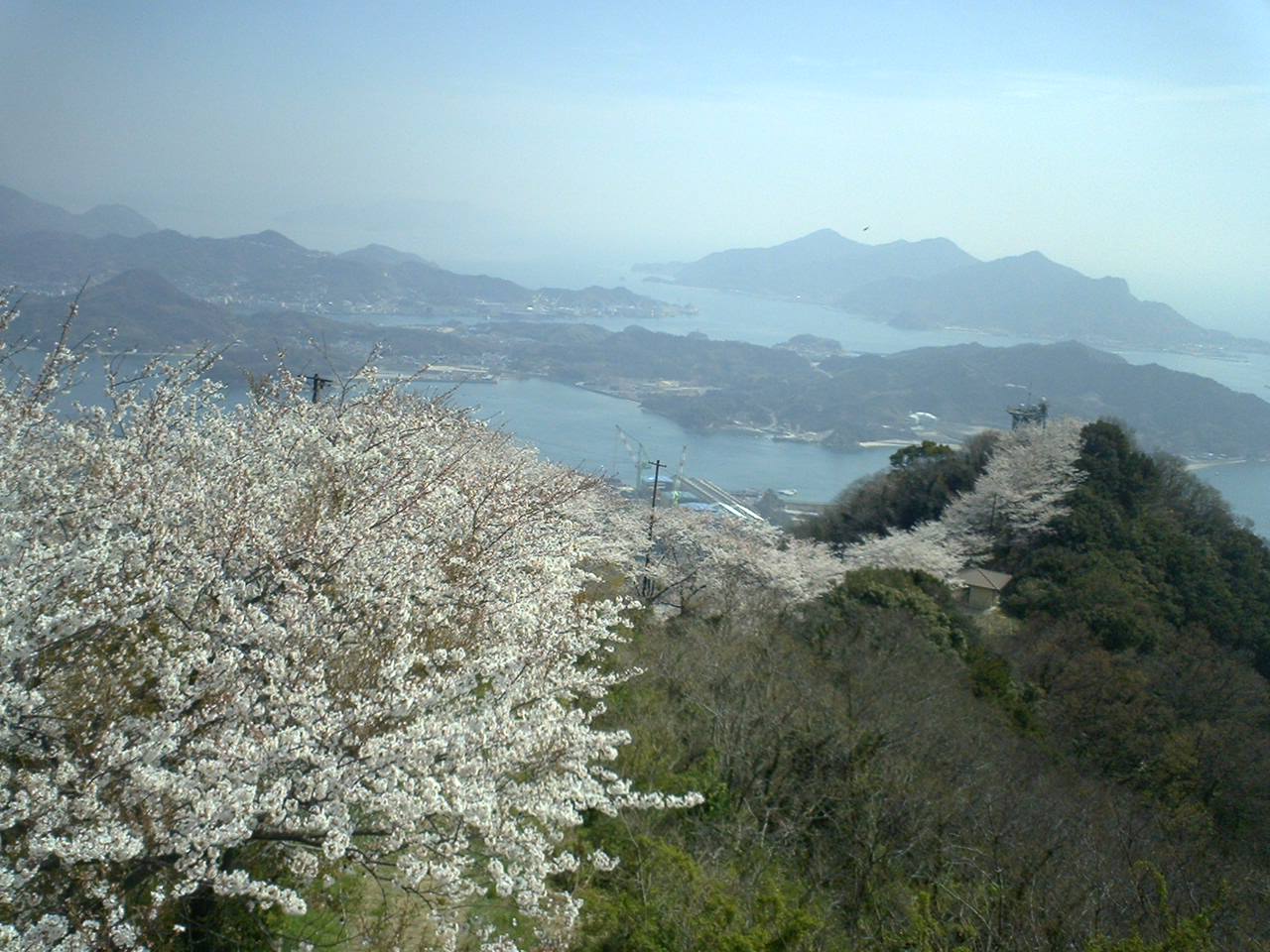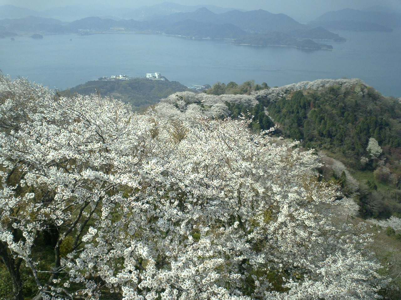 積善山山頂を東・生名島に向かい↑、西・伯方島↓に向かい、桜の尾根がつづく。