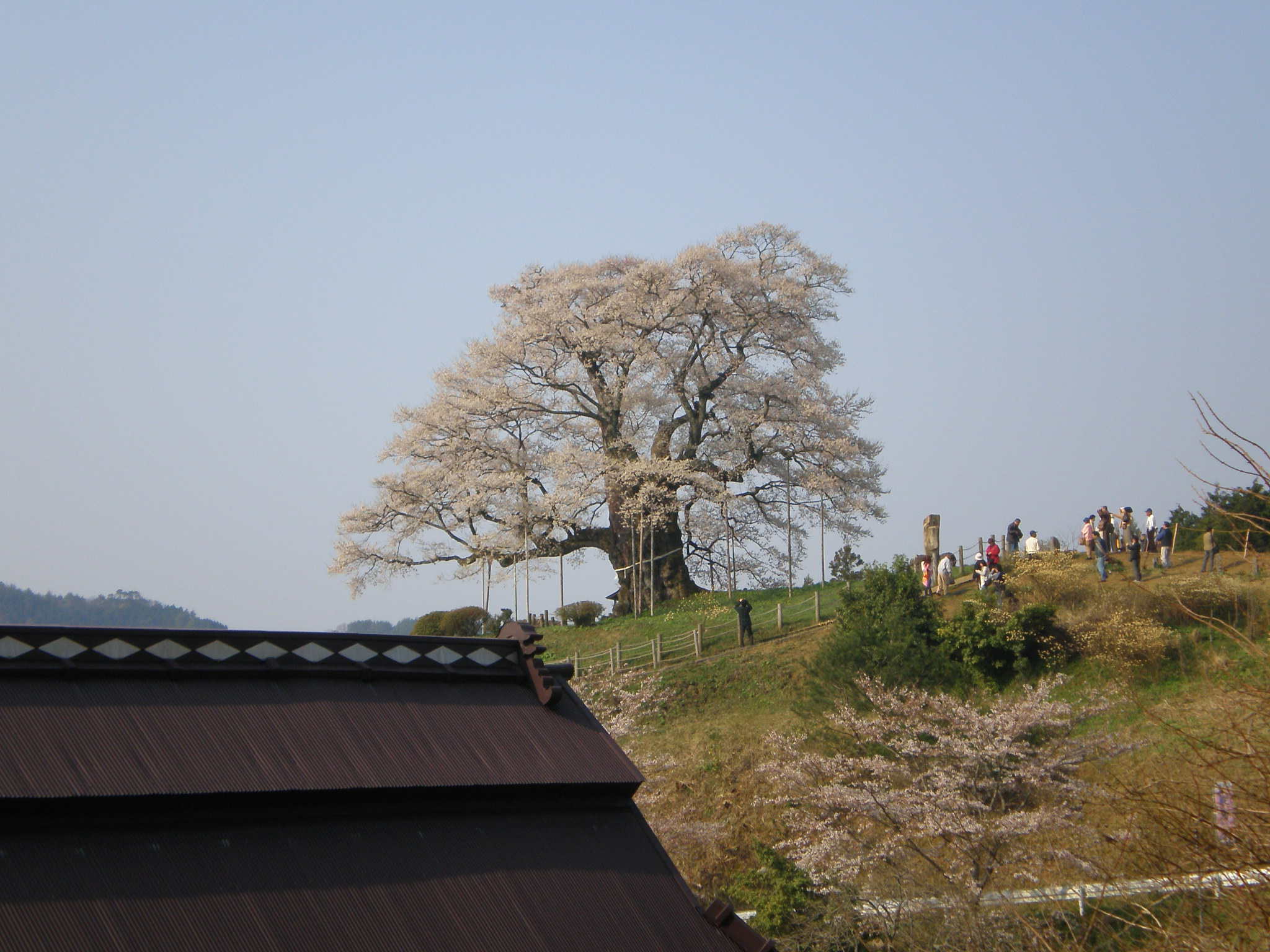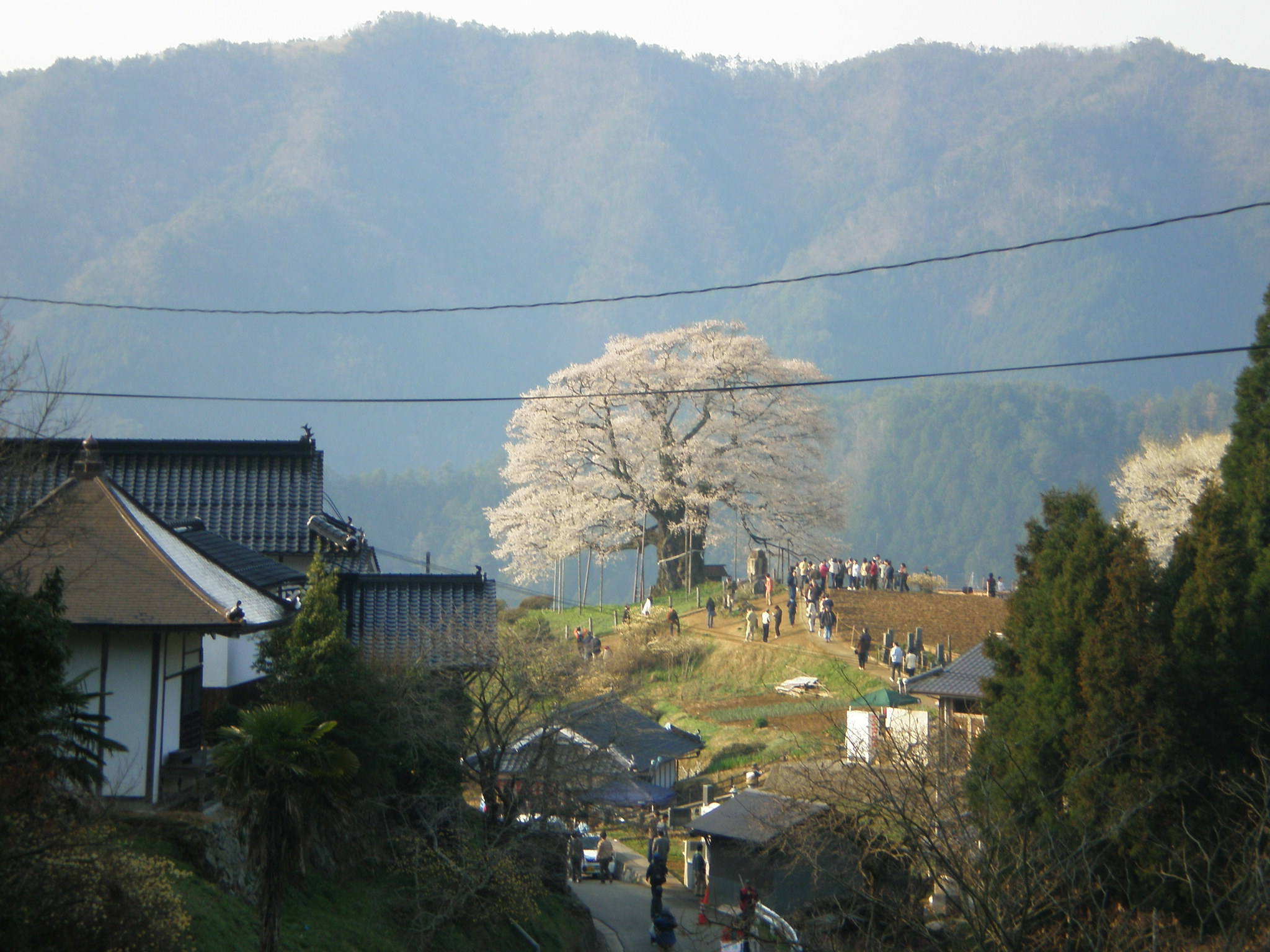 ぐるぐるとつづく山道を登り、誘導された駐車場から降りると。 そこには朝日にまぶしい「醍醐桜」が見えた。