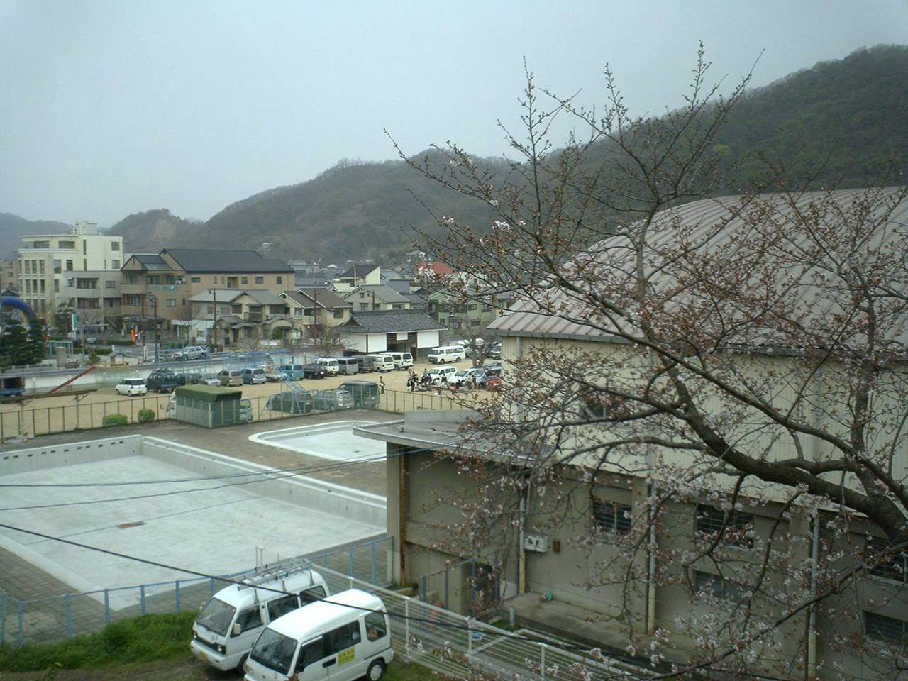 学校のうえからみる「笠岡小学校の桜」。