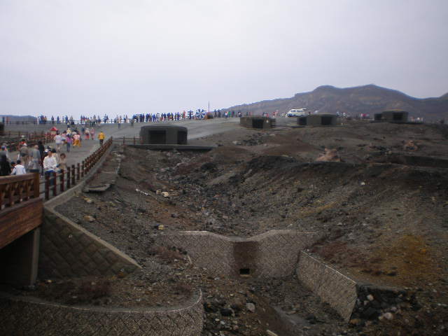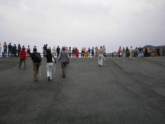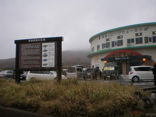 ロープウェイでバスから降りる、阿蘇の火口は霧か雲か噴煙か?