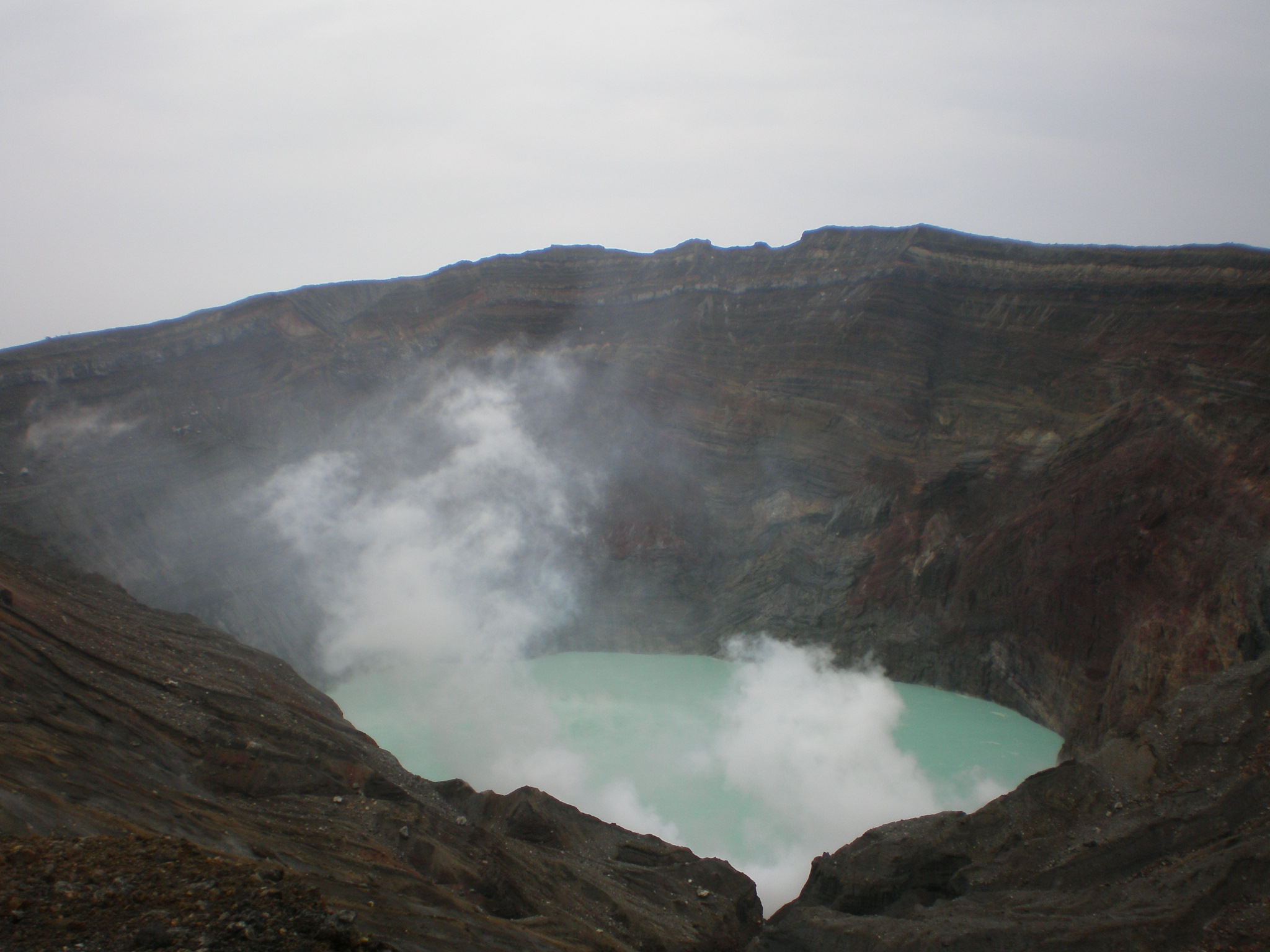 この火口は青い池となり、そこから噴煙をあげている。