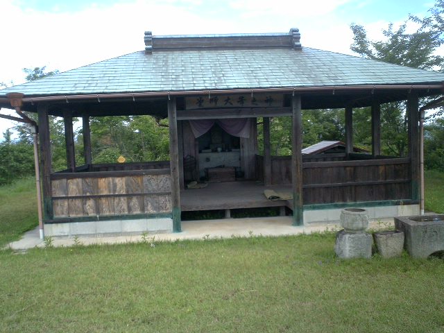 神の峰の山頂に「お大師堂」。 陶山の人により、お大師さまも山頂のまわりもきれいに清掃されている。 お大師堂の後ろは木々が繁っている。 残念ながら、 360度の展望は見えない、みはらしは前方の南180度いうところか。 |