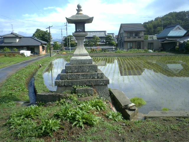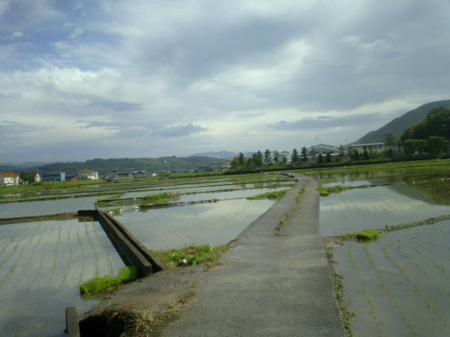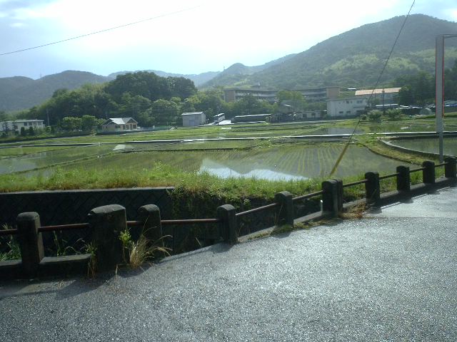 「新山八景」の「名所橋」から見る、笠岡市立新吉中学校と竜王山と、その前の水田。