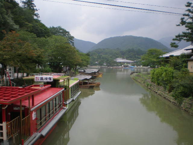 桂川に松林あり、そこで記念写真の人たち。 嵐山にきた実感がした。 渡月橋を渡る。 なにやら川の水量が多そうだ、 水草が横になったり土の色に染まったたりしている。 嵐山の遊覧船、 「増水のため本日休業」。 それは、 数多いボート、屋形船すべてが休業であった。