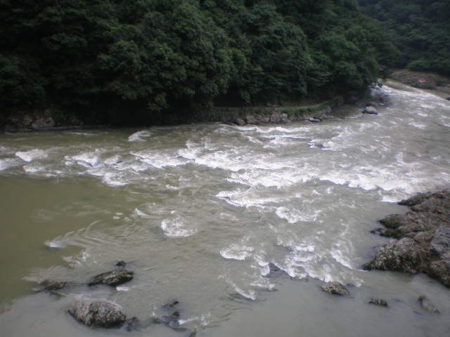 ふだんなら、この川を観光の船が下っている。渓谷と急流。