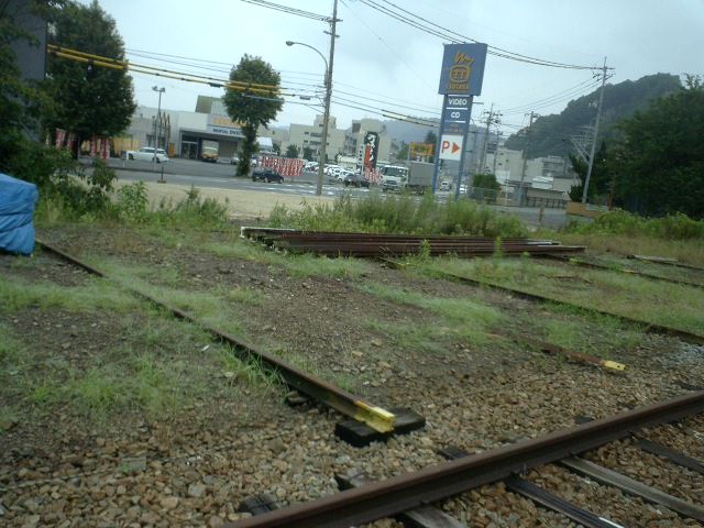 レールの枕木から見るツタヤ笠岡店と元ツタヤ笠岡店。