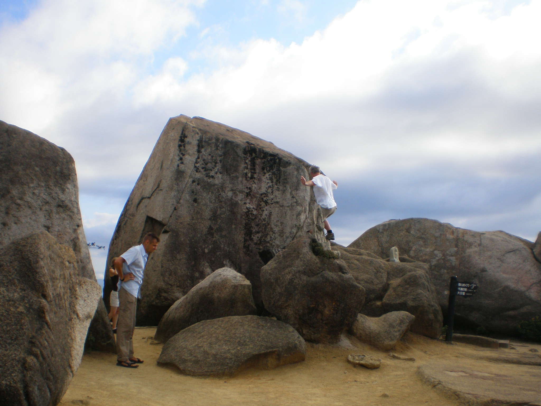 弥山山頂の岩で写真のポーズをする外人。