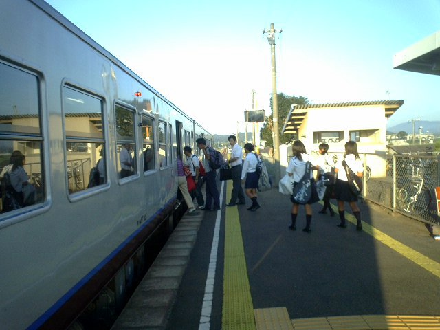 降りる人は少ないが岡山に向かって乗る高校生が多い、6:15の足守駅。