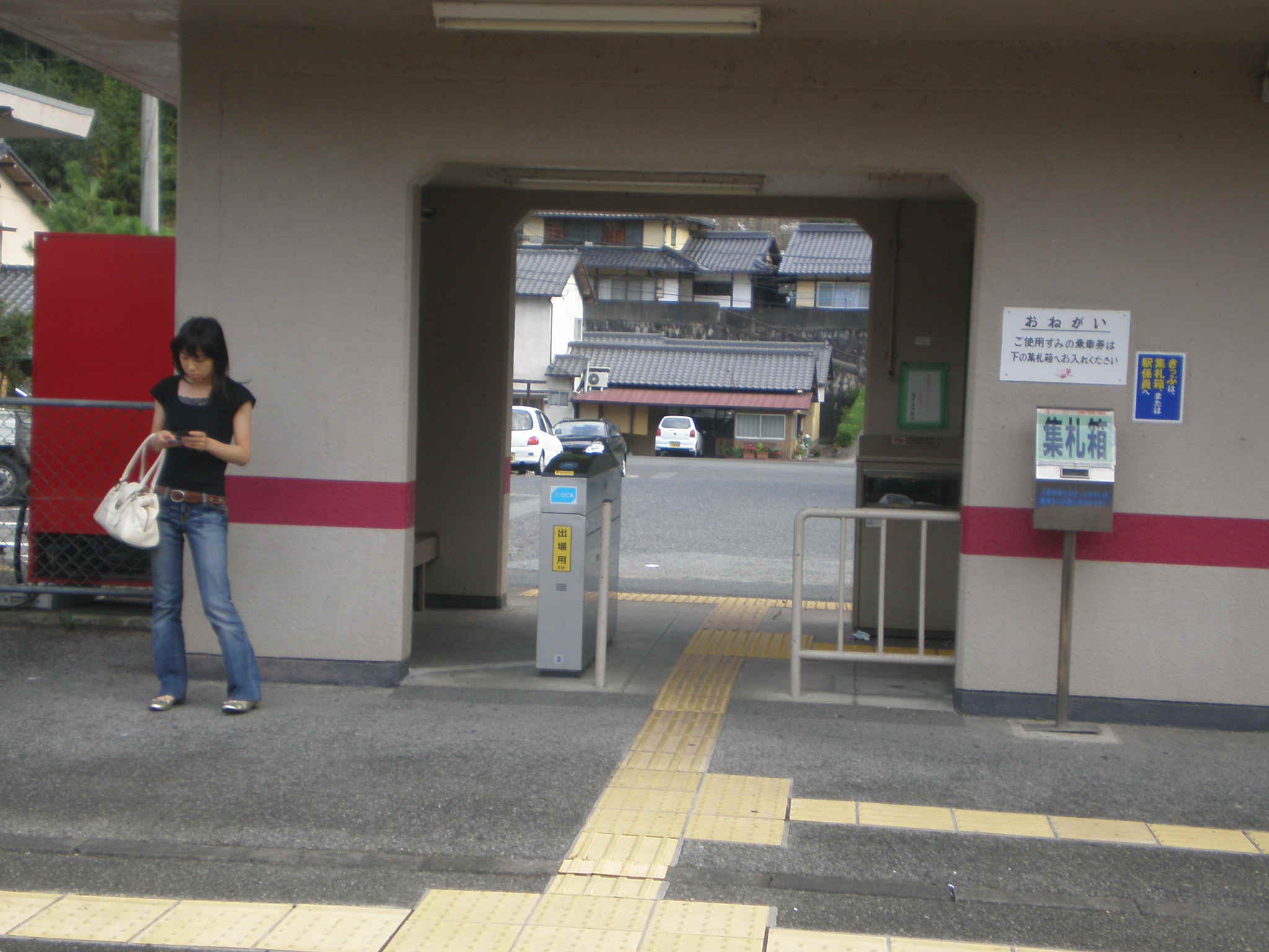 駅舎の自動販売機で切符を買い、それを写真真ん中「自動改札機」にとおし、切符の用が済むと写真右手「集札箱」に入れておしまい。はっきりと無人駅がわかる駅。