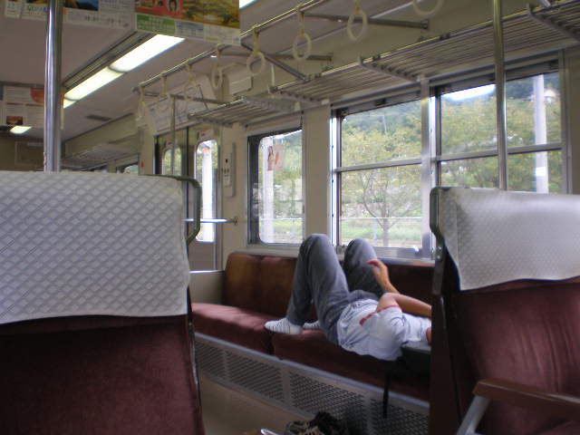 その巨大な高梁駅を過ぎたら、典型的な伯備線の車内風景となった,↓。