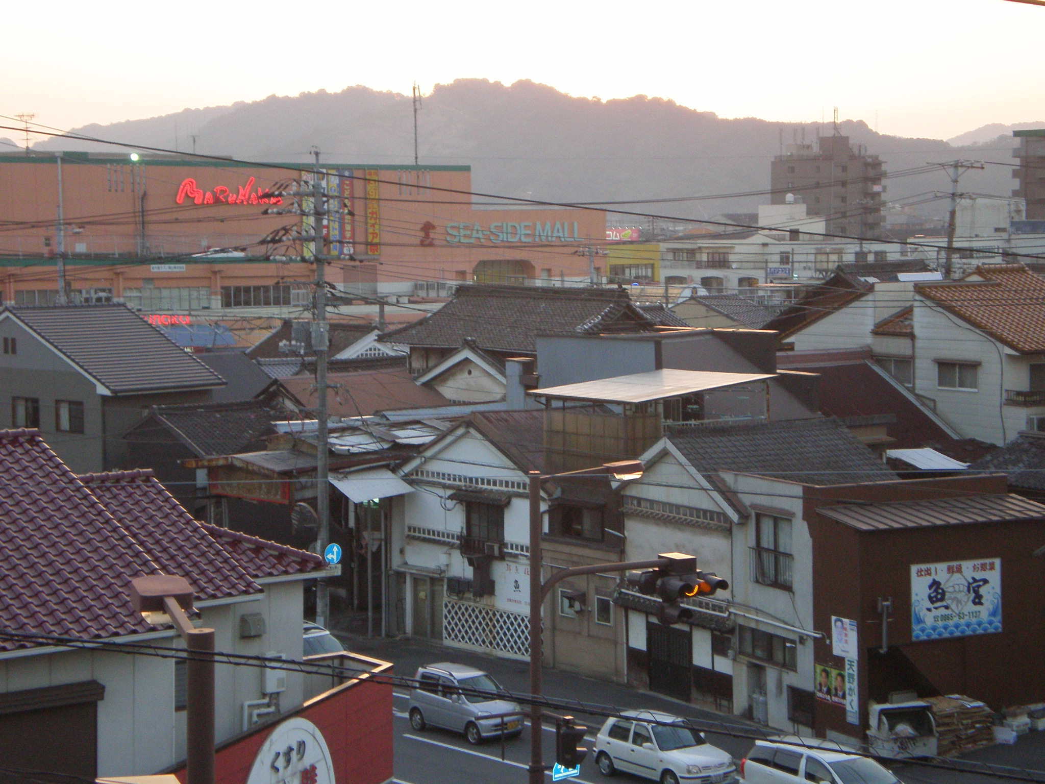 笠岡の街は夕暮れの色に染まりはじめている。
