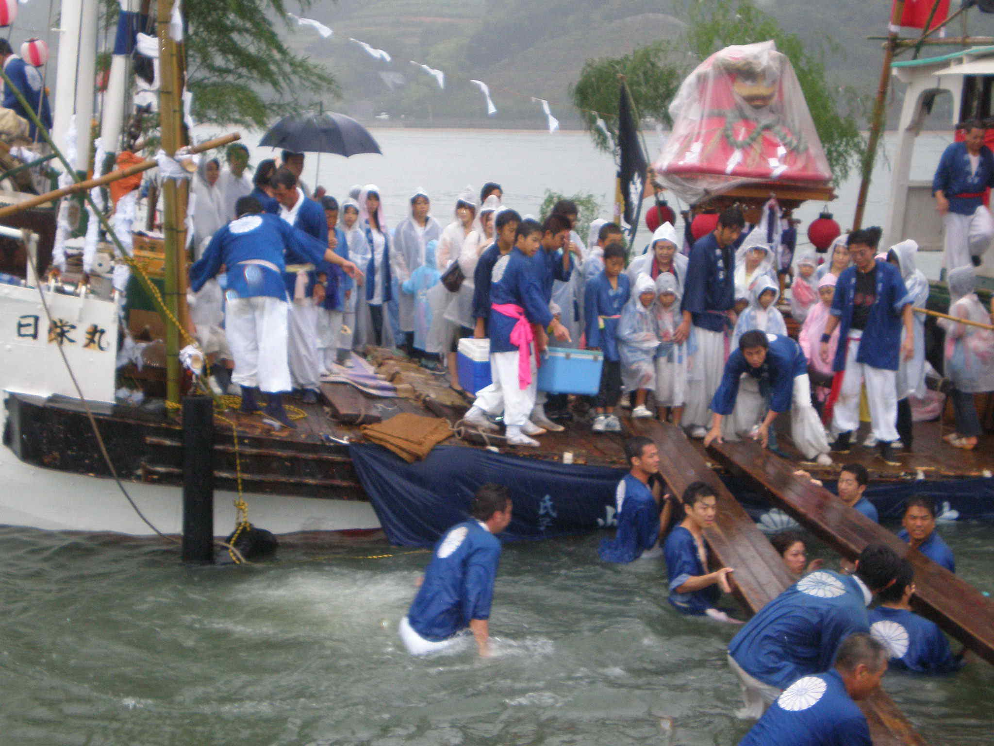 接岸した船は何本もの綱で陸と結び、船と陸との上陸用の板を何回も何回も位置決めした。