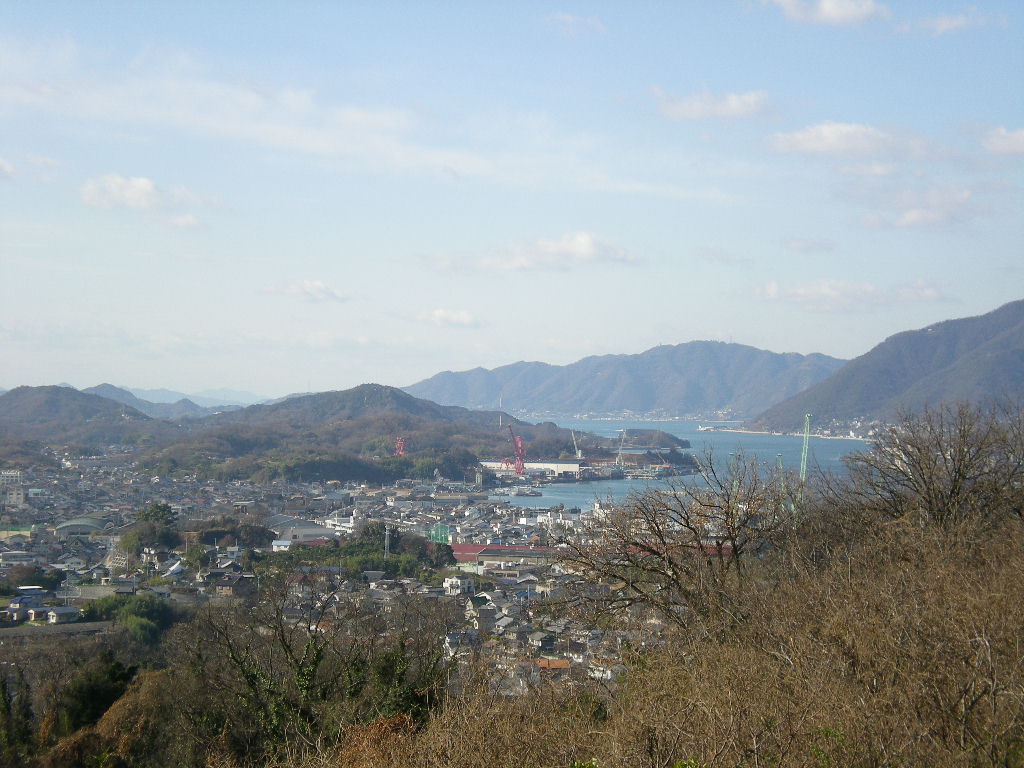 山頂から見る向島の町と造船所と尾道水道。
