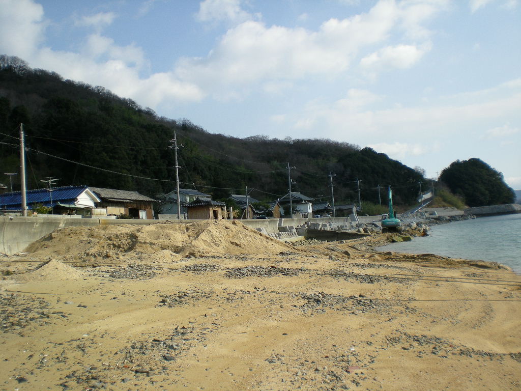 波返しの前の砂浜は消波ブロックに変える工事中。